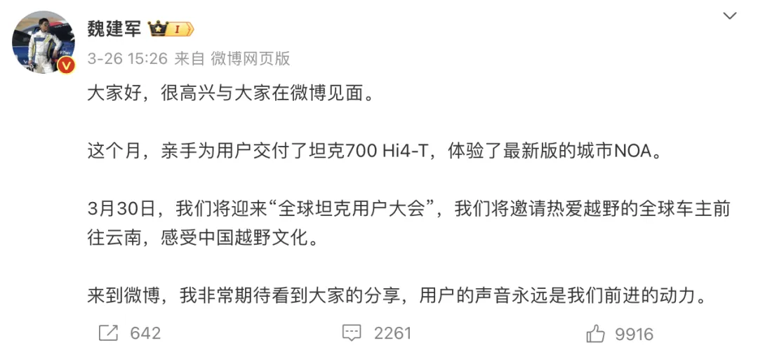 天眼妹发现,已经60岁、2000多亿身价的魏老板,今年3月底在社交平台微博上开通了账户并更新博文,表示“来到微博,我非常期待看到大家的分享,用户的声音永远是我们前进的动力 ”。
