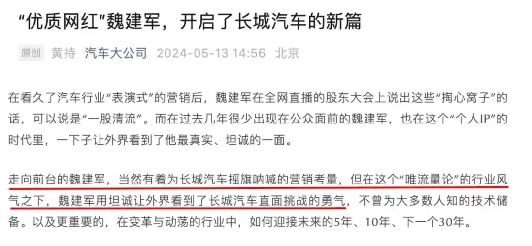 有自媒体在文章中表示:走向前台的魏建军,在为长城汽车摇旗呐喊的营销考量。