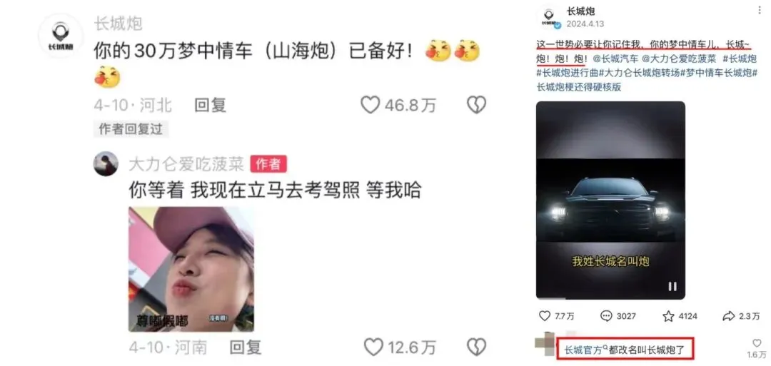 而长城汽车也抓住了这一波流量,联系到大力仑表示要送她一辆长城炮汽车。甚至有网友发现,长城官方账号都直接改名为成“长城炮”。