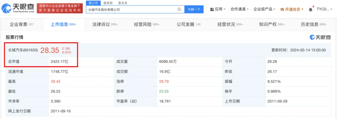 天眼妹看到,截止到5月14日收盘,长城汽车股价报收28.35元,总市值2422.17亿元。