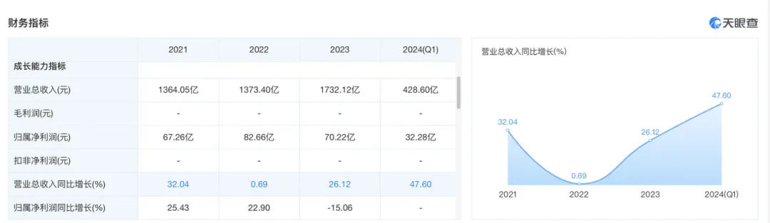 在其前不久的一季报披露中,净利润同比大增1752.55%,达32.28亿元。