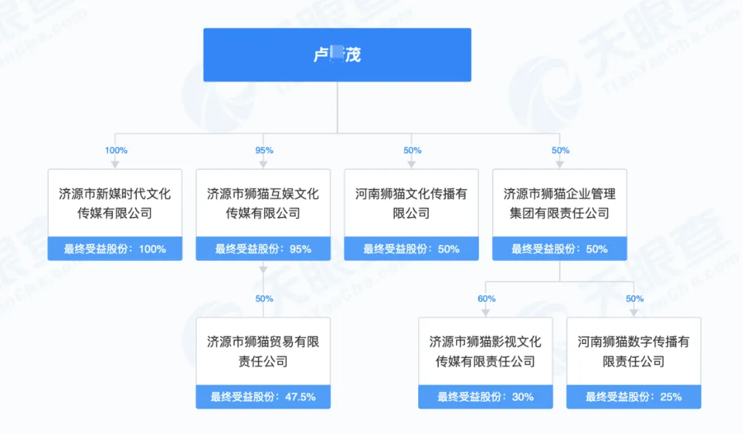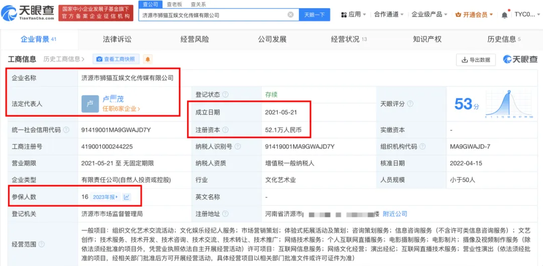 天眼妹看到,网友提到的大力仑背后的公司,全名为「济源市狮猫互娱文化传媒有限公司」成立于2021年5月,法定代表人为卢某茂,注册资本52.1万元,是一家文化娱乐经纪人服务公司。