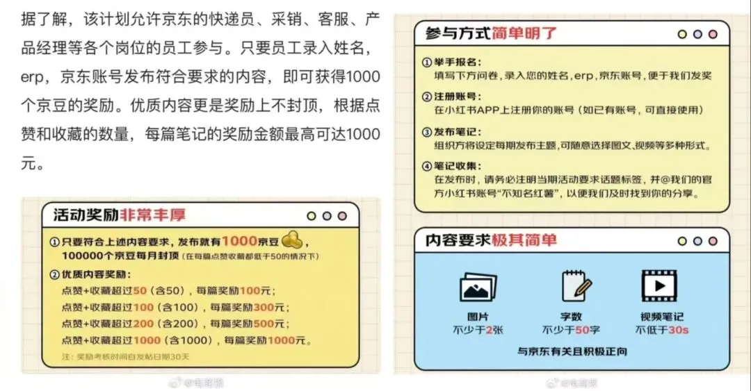 据自媒体报道,京东允许快递员、采销、客服、产品经理等各个岗位的员工参与,只要按照要求发布小红书笔记,即可获得相应的奖励,单篇最高奖励达1000元。