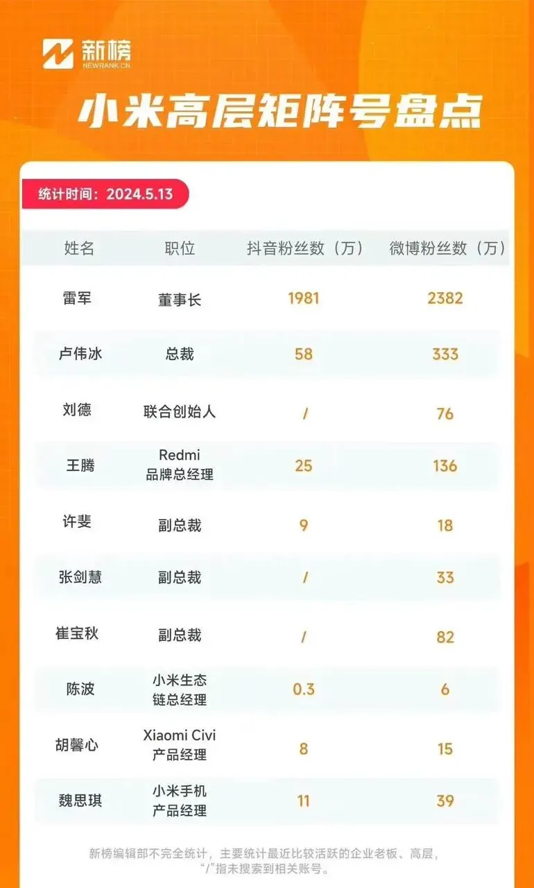 而据新榜发布的统计数据,小米高层员工开设了抖音和微博两个平台的账号,除雷军外,小米的总裁卢伟冰和Redmi品牌总经理王腾,账号粉丝人数均超过百万。