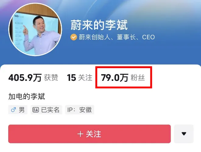 3月14日,小米汽车发布会前,蔚来汽车的创始人李斌在抖音平台开启直播,短短2小时就吸引了近400万人次观看。随后李斌在抖音账号的活跃度不断增加,到今天(5月14日)其账号粉丝数达79万。