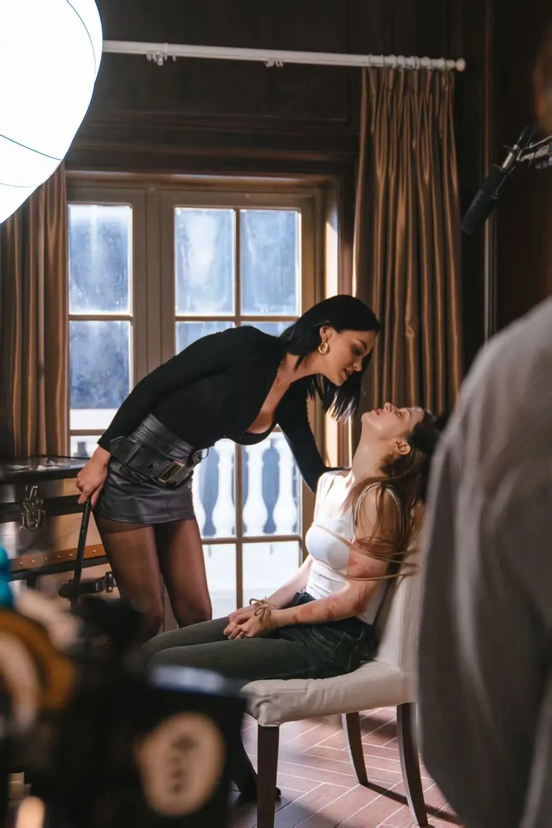 临平区临影厂副厂长张聪聪对我说,这46套场景是他们看了6000多部短剧、用人工逐一统计数据汇总出来的。数据导向的室内场景完全是为短剧服务的。在最高频的“霸总的家”,其空间模型大约是1∶1.25,预留了充足的长焦拍摄距离和动线——这是短剧里常见的近景与特写的空间保证。每个场景都有不低于66%的通光占比与三点化光源配置。张聪聪还特意带我逛了一个现代意式风装修的“女霸总家”:白色基调,布满了定制柜,橱柜、电视柜都充满了竖直线条,室内还有一些柱子。他解释:白色是因为女性妆造对视觉呈现影响很大,“所以环境对光的影响不能超过色染的13%”,竖直线条更能表现女性婀娜多姿的身体曲线,“全屋都是纵向的视听结构,这样就保证了在拍摄时任何一个角度都能有纵向直线去烘托女性的曲线”。