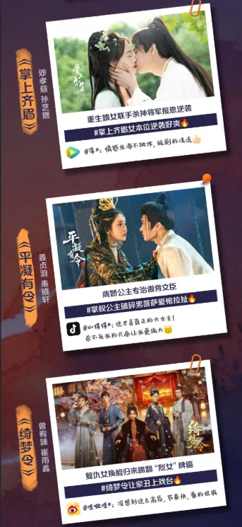 。3.《掌上齐眉》古装爱情类型,邓孝慈、孙艺燃、黎晟营、欧靖枭主演,站内评分9.0分。前世孤女苏锦沅(孙艺燃 饰)因逃婚导致满门忠良萧家遭灭顶之灾。重活一世,她先惩戒奸人,后与苏家切断亲情。她重回萧家,联手萧家养子谢云宴(邓孝慈 饰)查明真相,改变萧家命运。4.《平凝有令》古装爱情类型,姜贞羽、秦晓轩主演,站内评分8.8分。剧情讲述李元泽(秦晓轩 饰)恩师假借他的名义写下奏折,亲手将大靖长公主萧平凝(姜贞羽 饰)送往北疆和亲。五年里,长公主受尽折磨,直到大靖击败北疆,才得以重回朝堂。昔日恋人朝堂重逢,她怀着恨意开启了复仇和救赎之路。5.《以下犯上》古装权谋复仇类型,郑湫泓、张婉莹、沈芝弈、邓超元主演,站内评分8.2分。聪明机智的陆九宁(郑湫泓 饰)与姐姐宋婉儿(张婉莹 饰),被京城官员从教坊司买走,当作讨好皇上的礼物送入深宫。姐妹俩本只想低调安稳度日,却频频遭遇致命暗算,陷入绝境。