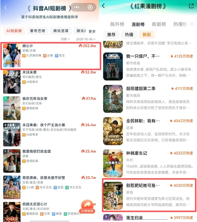 中小创作团队(含CP方)凭借灵活高效的优势占据一席之地,雪宝工作室最具代表性。该团队借助可灵AI实现“一人成片”,跑通工业化制作流程,打造《婉心计》《别惹肥妃她可是五核驱动》两大爆款:前者登顶“抖音AI短剧榜”,播放量高达2000万+;后者斩获了4020万红果热度,并成为红果漫剧榜TOP10中唯一一个上榜的写实短剧,印证中小团队借助AI弯道超车的可能性。