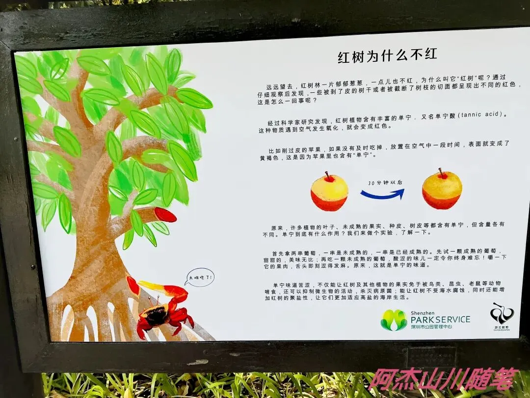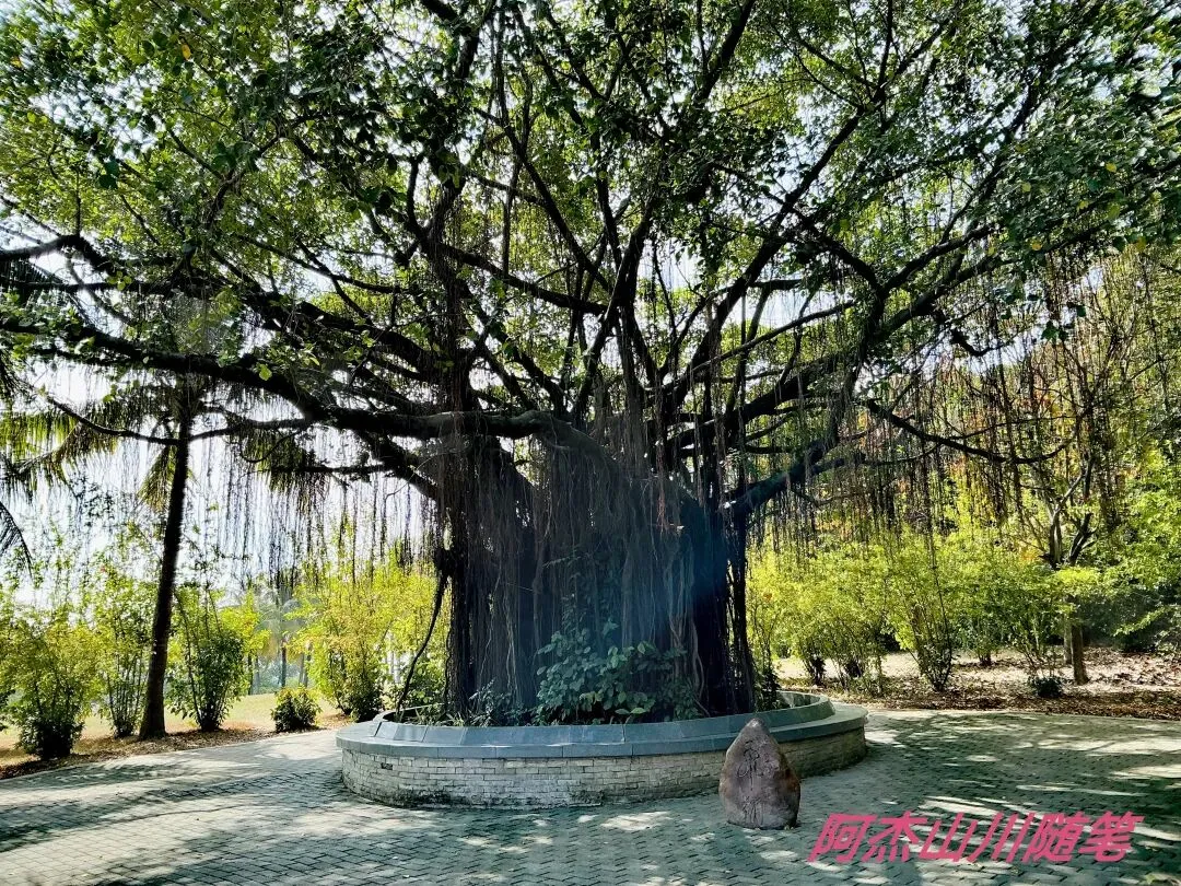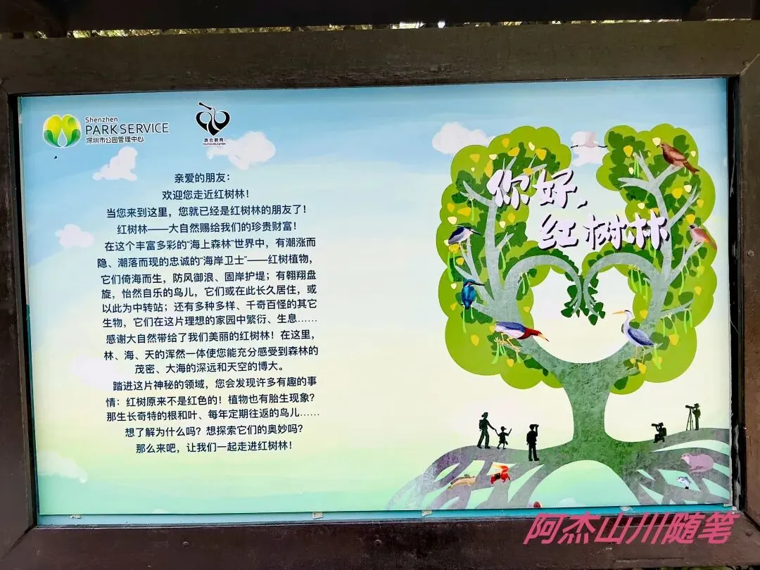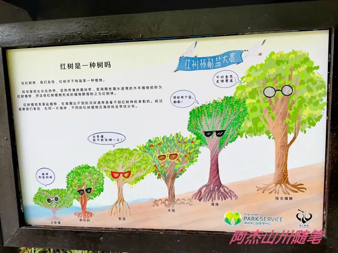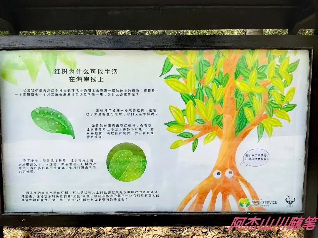 顺着人行通道步行直达海边,一路上的科普小长廊详尽地介绍了红树林,细心的游人会增长很多知识。走着走着看到一棵大榕树,可以说一木成林了。