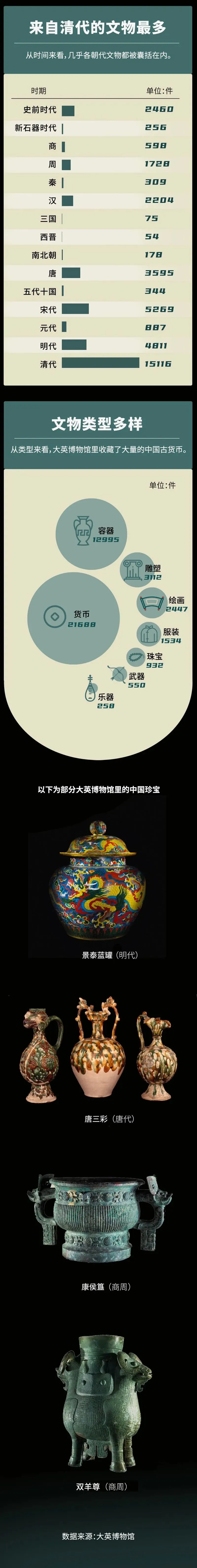图:上观新闻制作从新石器时代的玉琮、玉斧,商周的青铜器,秦汉时期的铜镜、陶器、漆器、铁剑,到唐宋的瓷器,明清的金玉制品……大英博物馆中的中国藏品几乎囊括了所有艺术类别,跨越了整个中国历史。