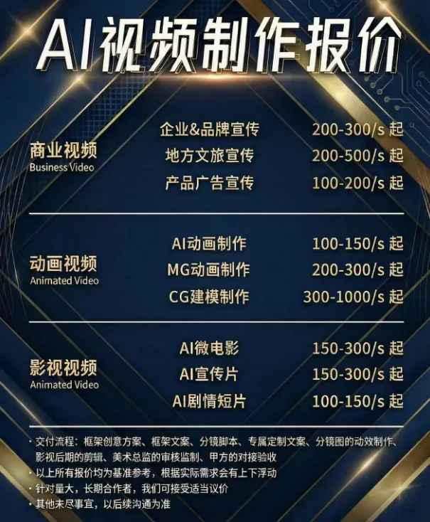 这个年轻团队过去一年已经承接了多个行业广告、宣传片,还拿了20多个业内奖项。他们在社交账号上公开过AI视频制作报价:商业视频每秒100-500元起,动画视频每秒100-1000元起,影视视频每秒100-300元起。最贵的动画CG建模类,每秒300-1000元起——按影视类最低价换算,一分钟视频也要6000元起步。