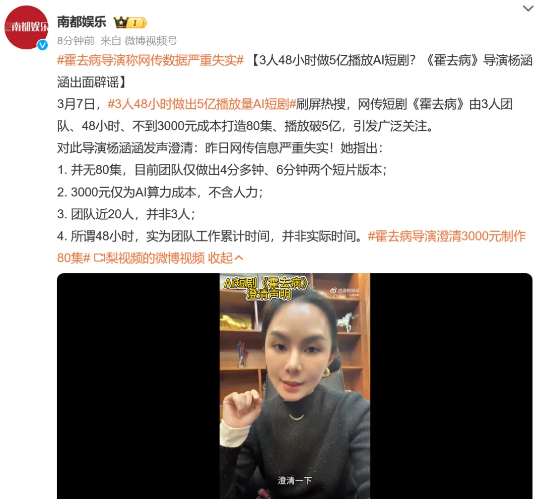 3月8日,据橙柿互动等媒体报道,短剧《霍去病》上线一个多月爆火,“3人48小时做出5亿播放量AI短剧”等话题冲上微博热搜,导演曾一度回应无法准确统计。