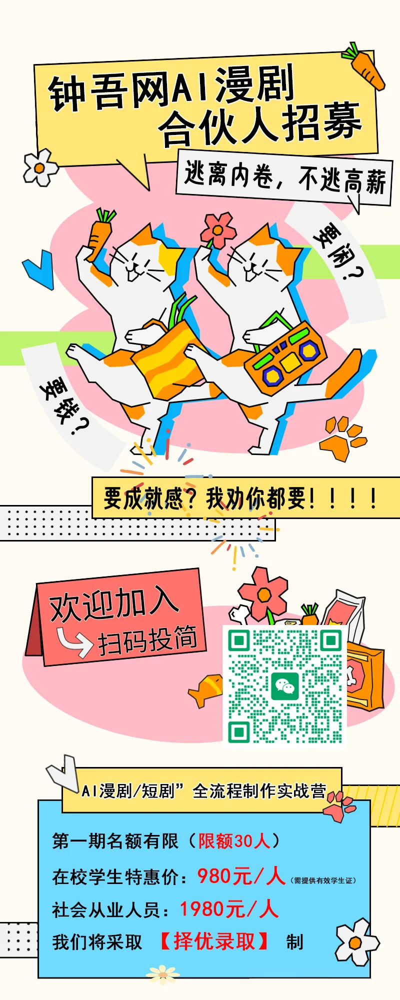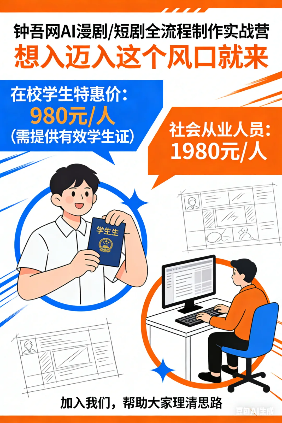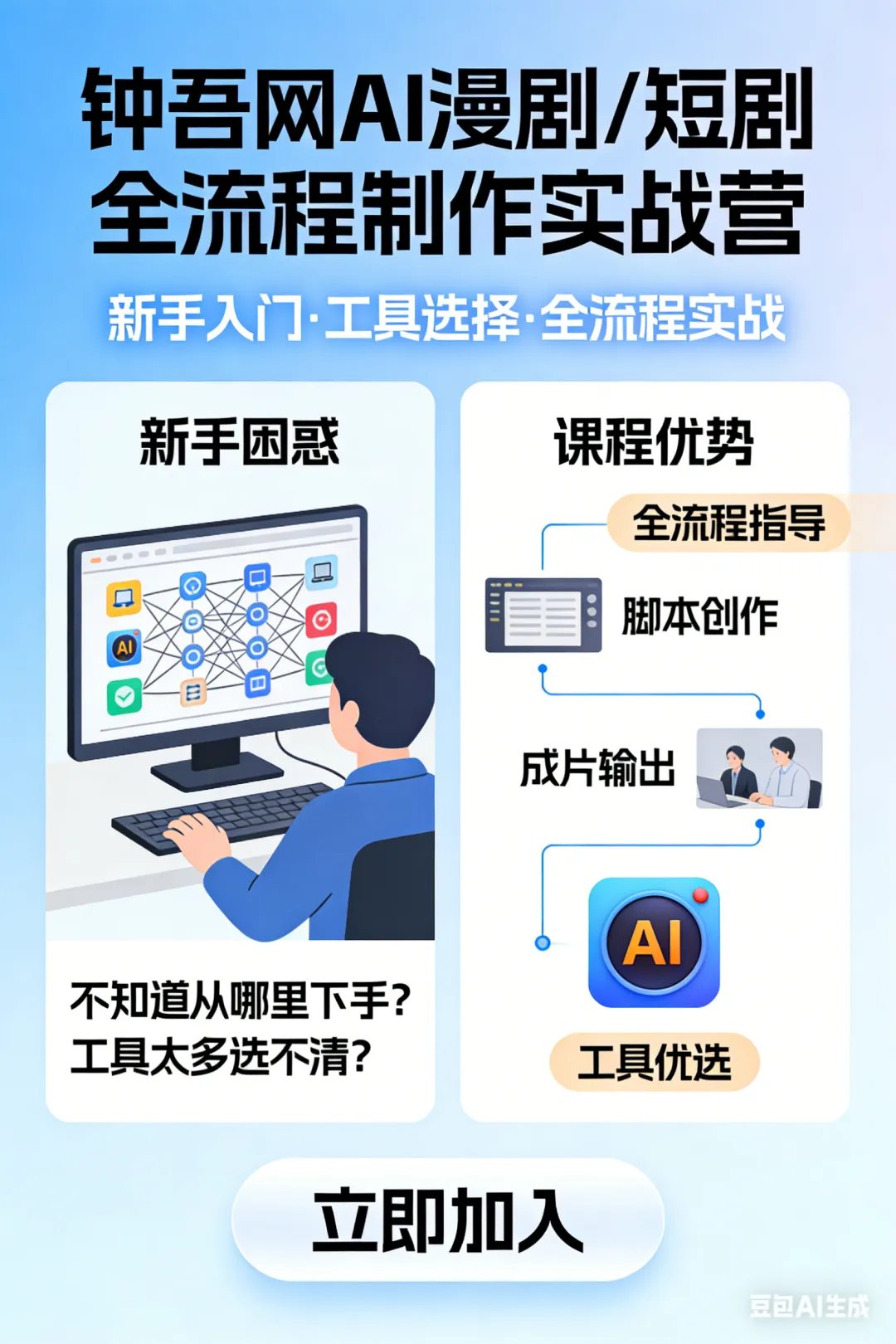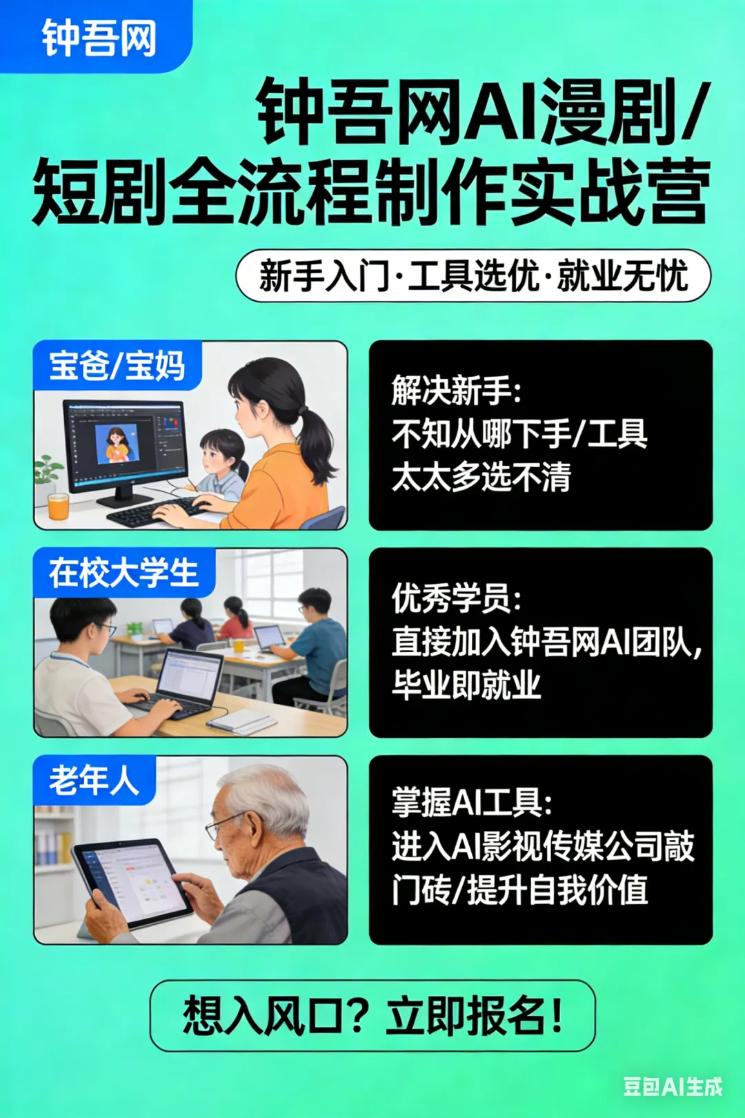 不少想抓住这波风口的新手,却常常卡在 “不知从何入手”“工具太多不会选” 等问题上。如果你也想系统入局 AI 漫剧赛道,不妨了解一下钟吾网 AI 漫剧 / 短剧全流程制作实战营,我们会帮你梳理清晰路径,从零到一掌握完整制作流程。