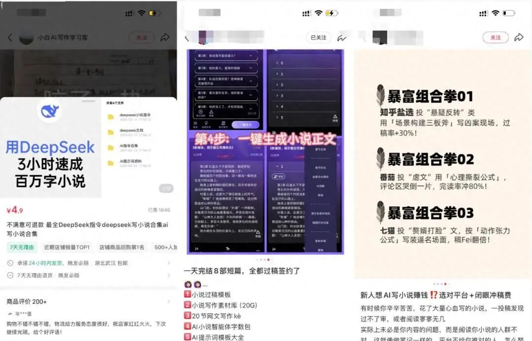 转到网文圈,AI卷得更狠。2024年3月1日,番茄首秀新书5606部,去年同期才400部,直接飙了1302%。不少网文编辑直言,收到的投稿差不多有四成都是AI生成的。舟舟做网文编辑,她说去年年底开始AI稿子一下就多了,最大的变化就是效率飙升——一天能写好几十万字。网上还到处是“AI网文课程”“一键成文工具”,号称“3小时百万字”、“一晚上结8部短片”,还晒稿费、签约截图,课程售价从几毛到近百块不等,销量特别猛。