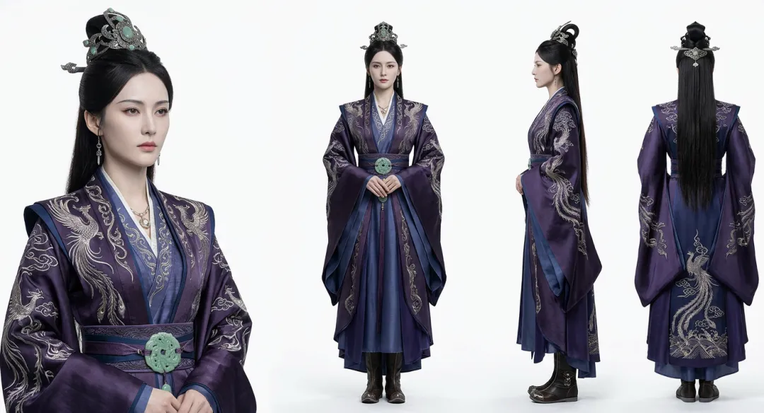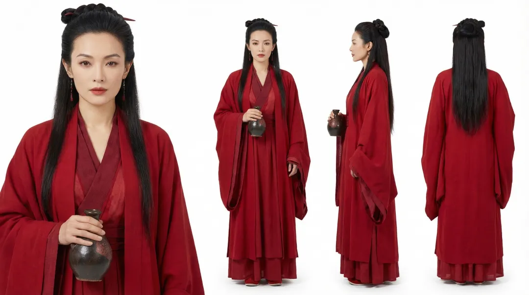 提示词:[标准人设出图,人物全身的正侧背三视图,背景纯白,左侧近景胸像,右侧全身三视图:正视图、侧视图、背视图。完全真人写实风格]。