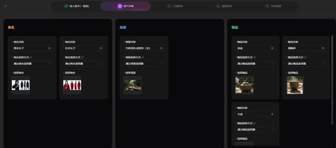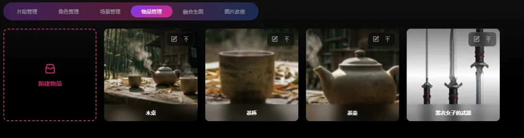 巨日禄将影视中常见的几个关键元素,拆成了【角色管理】【场景管理】【物品管理】,方便后续在融图 融视频阶段可以直接调用。