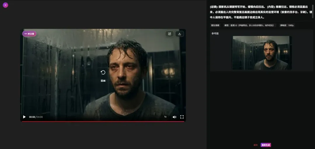 可以看到Agent生成的提示词 非常详细和专业,包括人物坐的方位,机位,运镜等都写的很清楚