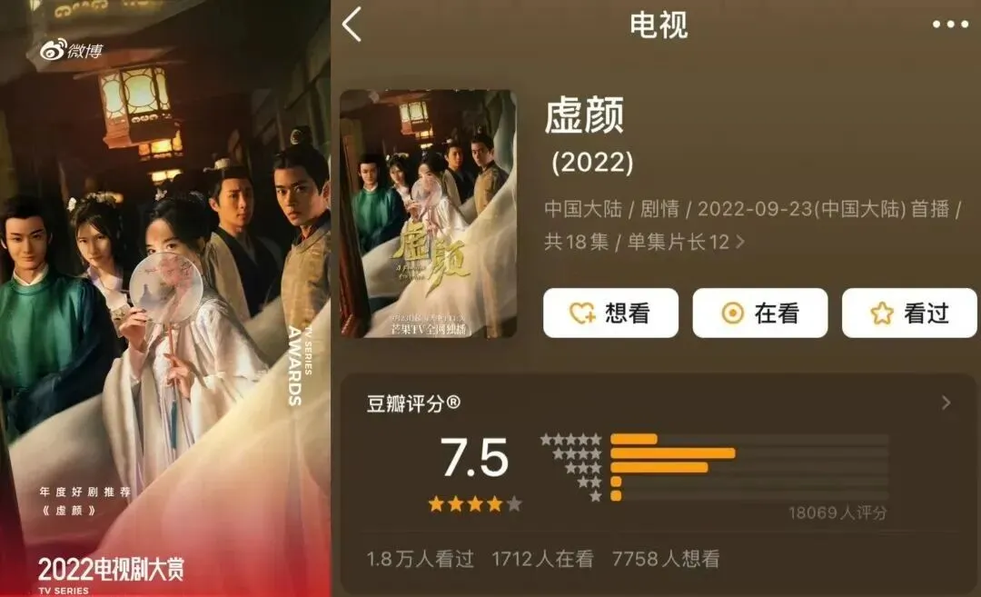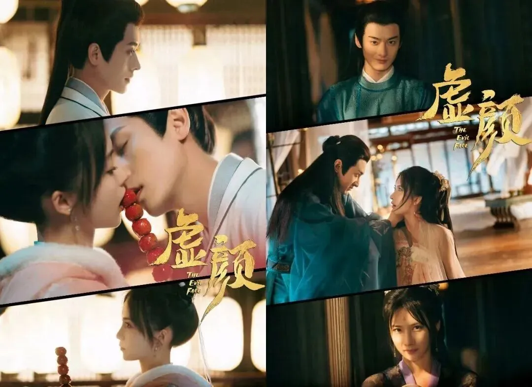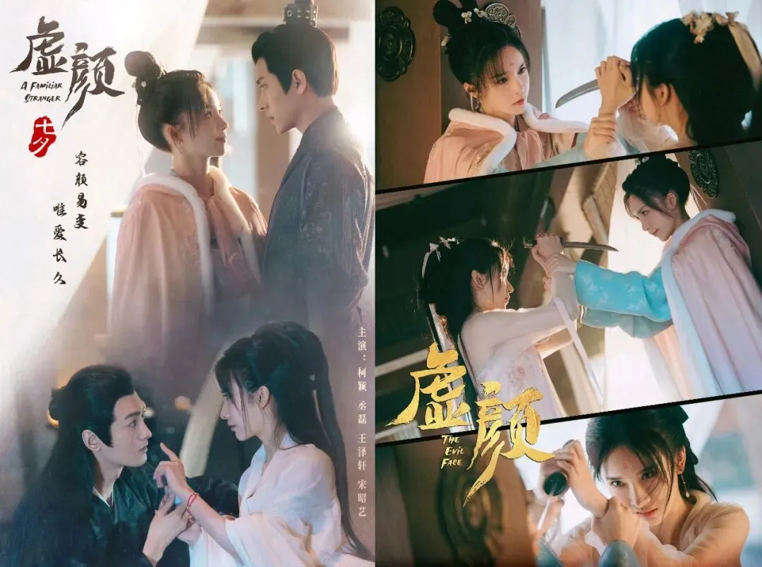 2022年古装武侠悬爱短剧,凭借“双面夫妻相爱相杀”的反差设定、电影级镜头美学和演员的化学反应迅速出圈,被观众誉为“古装版史密斯夫妇”。白天是温柔郎中与针线绣娘,夜晚是顶级杀手与隐秘间谍,双强隐婚,两人为了藏身份极限拉扯,笑料百出、看点十足。节奏快到飞起,没有狗血误会,没有拖沓注水,短短十几集,爽点、笑点、苏点、甜度全部拉满。这部剧成为首批上星短剧,芒果站内播放破4亿,全网话题22亿+,拿奖到手软,也让曾庆杰一跃成为短剧顶流导演。2.《虚颜》:换脸古偶天花板,短剧美学的开山之作