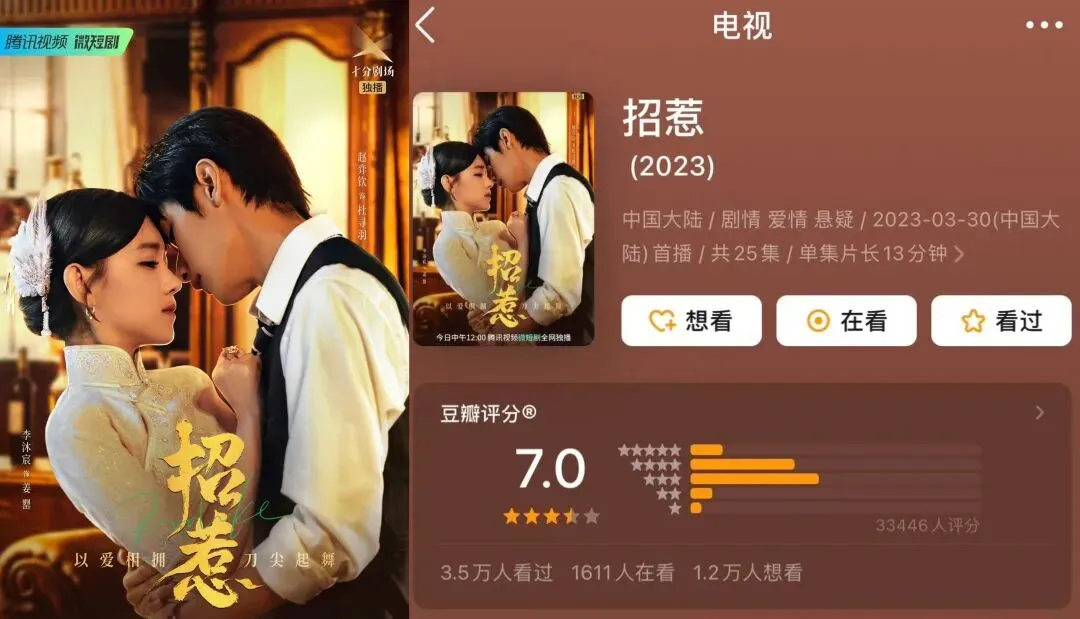 2022年古装换脸权谋甜虐短剧,凭借换脸替嫁、身份错位的新颖设定,打破古偶套路,悬疑、爱情双线并行,用电影级镜头+东方美学把“氛围感”拍到了极致,成功破圈到长剧观众。画师女主被大小姐女二以秘术换脸,替嫁入将军府,而男主正是三年前救过女主、让她一见钟情的将军;女二则顶着女主的容貌,如愿留在心上人宁王身边。四人陷入真假身份、错位心动、权谋暗斗的局中局。该剧贡献众多出圈高甜名场面:一箭穿耳环、糖葫芦吻、撕面具掉马吻、火场剖白吻、雨夜撑伞、雪景重逢,还有由男主丞磊无意设计出的“滑跪抱”,成为全剧高光,也让丞磊首次大规模出圈。这部剧口碑爆表,抖音相关播放量超120亿,全网话题38亿+,成为短剧赛道标杆。3.《招惹》:民国暧昧教科书,短剧圈的“情欲美学”