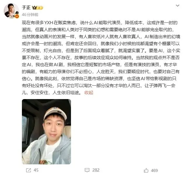 于正认为AI剧是“短暂的市场产物”,这并非盲目乐观,而是一种博弈后的清醒