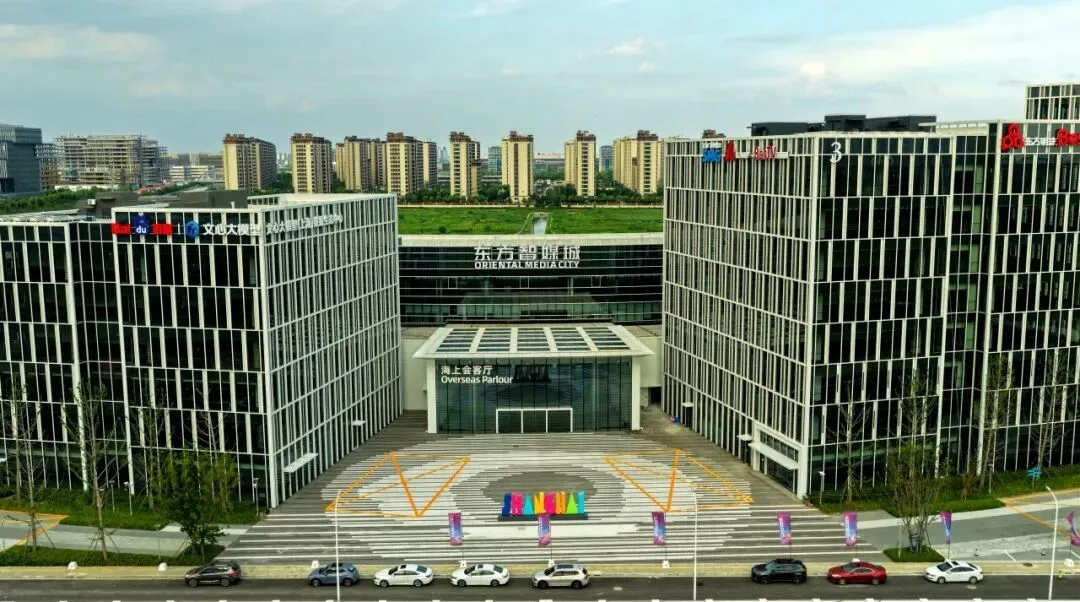 东方智媒城位于闵行浦江镇,紧邻地铁8号线,占地面积约400亩,总建筑面积约100万平方米,以共享、智慧、活力为三大核心开发理念,积极布局面向移动互联网和人工智能技术的新媒体数字化基础设施,是上海广播电视台媒体深度融合高质量发展的头部展示平台与产业主基地,力争建成具有国际影响力的国家级网络视听基地新片区和特色鲜明的大视听产业集聚区。项目分四期建设,一期已正式开放,并设立上海超高清视听产业开放服务平台、微短剧出海产业生态及开放服务平台、“微短剧综合服务站”、“版权工作服务点”等产业服务平台。