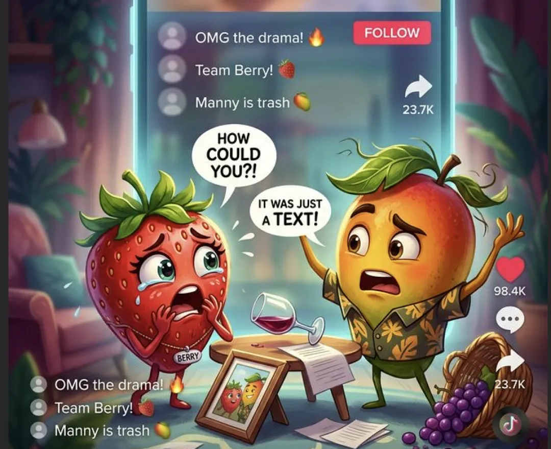 一个叫Ai Cinema的账号,用纯AI生成的"水果版爱情岛"(恋爱撕逼综艺),10天涨粉330万,总播放量超过2亿。