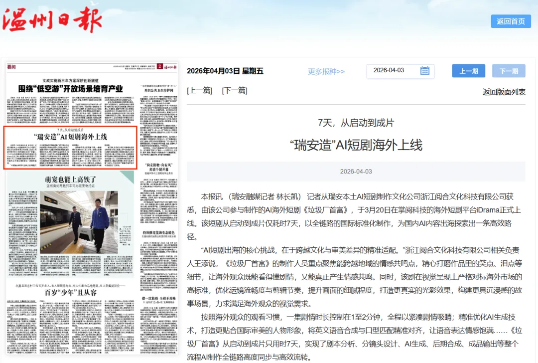温州日报刊登瑞安本土公司参与制作的AI短剧《垃圾厂首富》,从瑞安驶向海外。该短剧从启动到成片仅耗时7天,以全链路的国际标准化制作,为国内AI内容出海探索出一条高效路径。