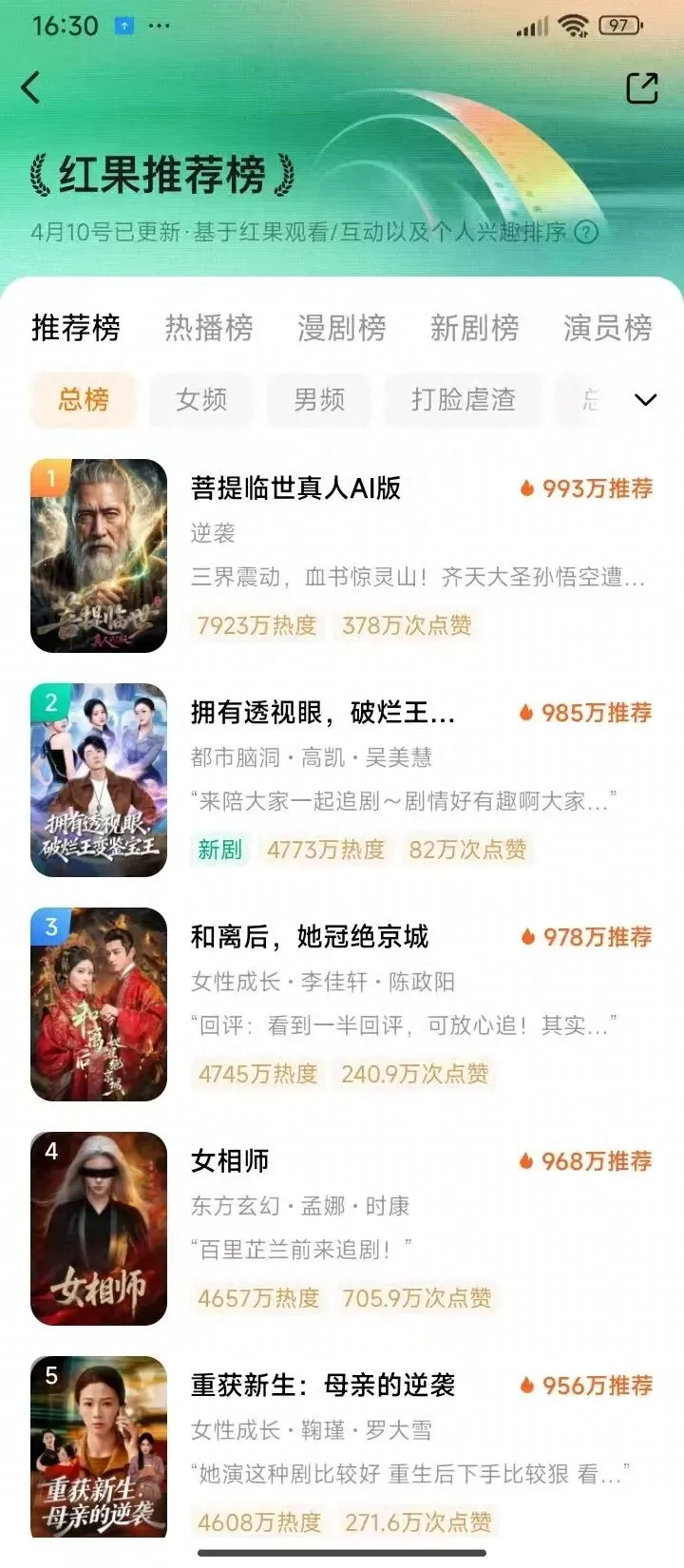 更关键的是,红果平台最近正在灰度测试“合榜”——不再区分真人实拍短剧和漫剧,统一热度排名。这意味着AI剧要和真人剧在同一个池子里正面比拼。而《菩提临世》不仅上了总榜,还拿了第一。