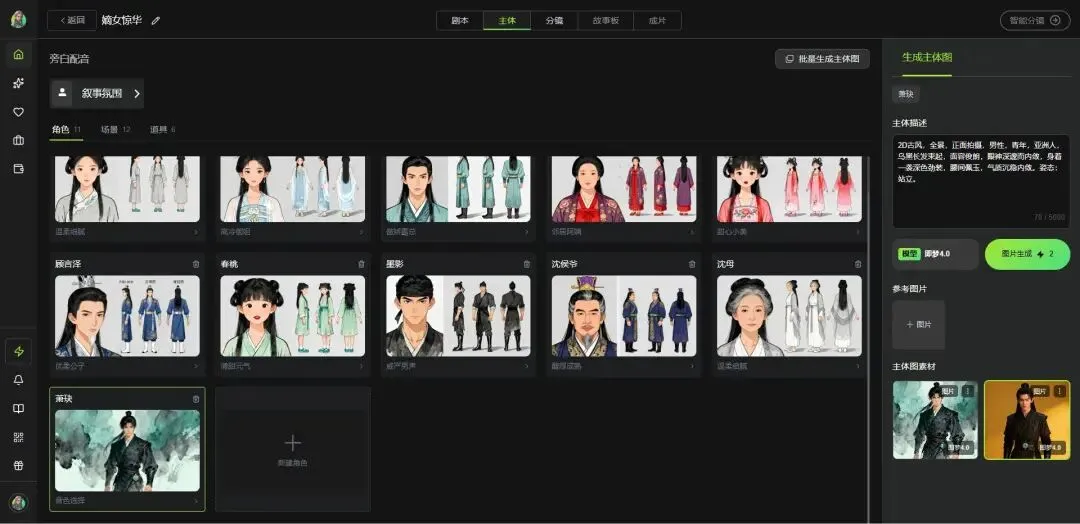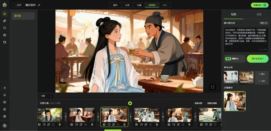 我现在用的工具是有戏AI。它把剧本、角色、分镜、视频、配音全都串在一起,不用在七八个工具之间来回切换。最实用的是它的“分镜提示词”功能——系统自动为每个镜头写好画面描述,省掉了大量反复抽卡的时间。